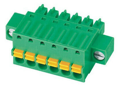 This green plug features a 3.81 mm pitch and an additional flange with screws, available in 2 to 24 poles. It’s ideal for applications that demand both space efficiency and strong mechanical retention.